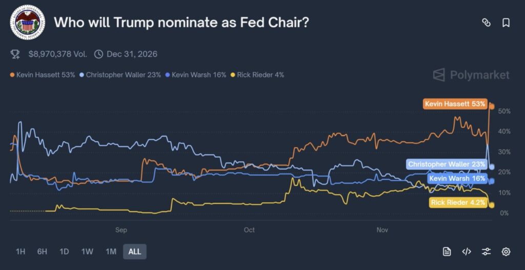 Di Polymarket, kontrak yang melacak perlombaan ketua Fed menunjukkan Hassett sekitar 53% pada waktu pers, memperkuat pergeseran dari spekulasi menjadi kasus dasar yang probabilistik.