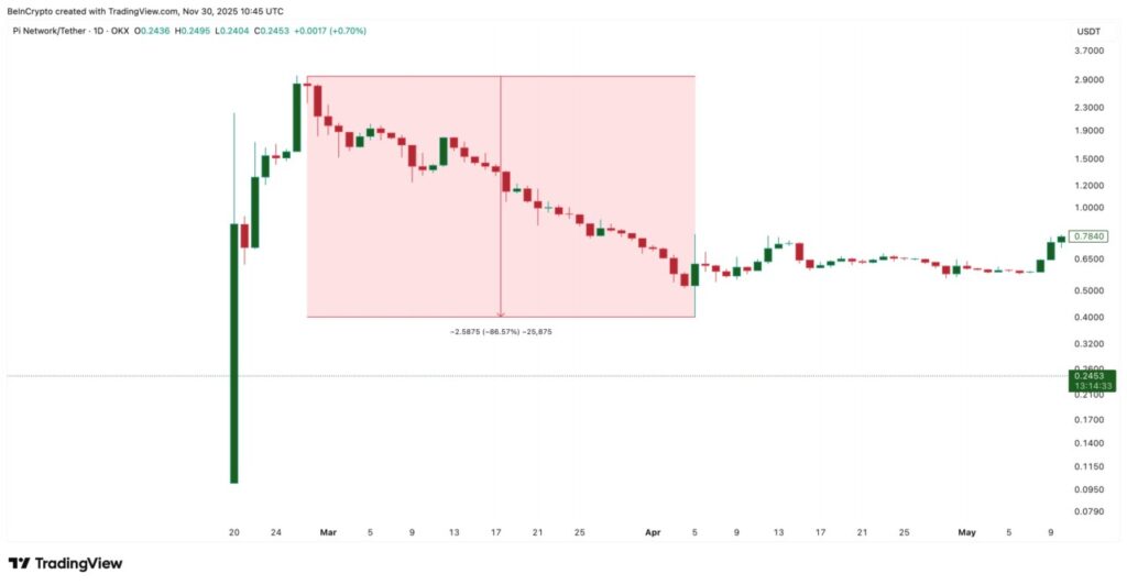 Keduanya mengalami pola harga yang sama: lonjakan cepat setelah listing diikuti penurunan tajam dalam waktu singkat. Pi Coin sendiri telah turun lebih dari 90% sejak peluncurannya.