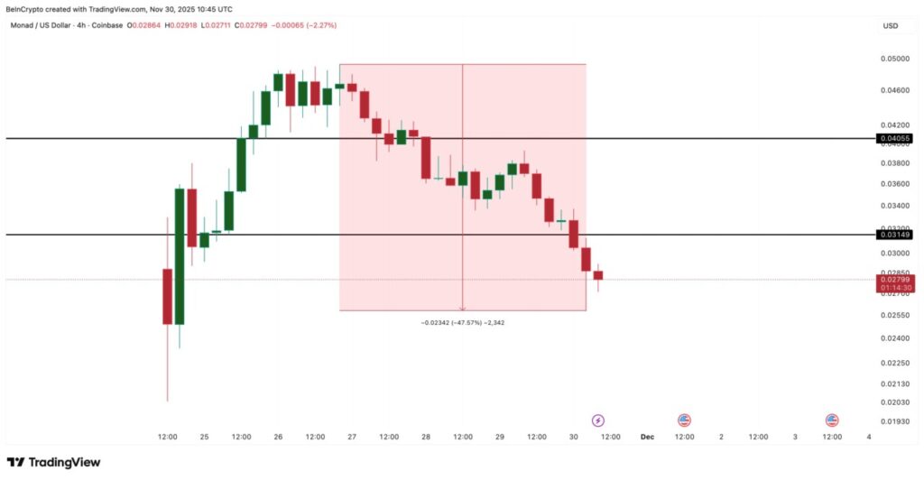 Monad (MON) turun sebesar 47,57% dalam 4 hari setelah mencapai harga tertingginya. Pola ini sangat mirip dengan Pi Coin (PI), yang juga menunjukkan lonjakan cepat di awal diikuti dengan penurunan tajam.