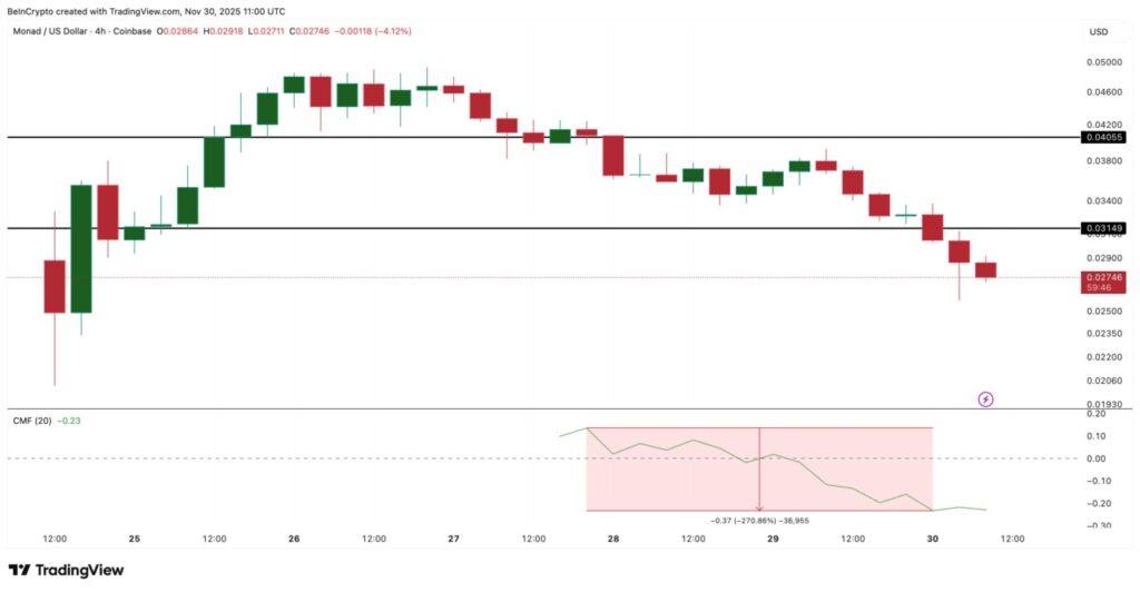 Indikator teknikal Chaikin Money Flow (CMF) menunjukkan bahwa sejak 27 Oktober 2025, aliran uang besar ke MON terus menurun lebih dari 270%. Angka CMF yang negatif menunjukkan bahwa pelaku pasar besar atau whale tidak lagi menambah posisi pada token ini.
