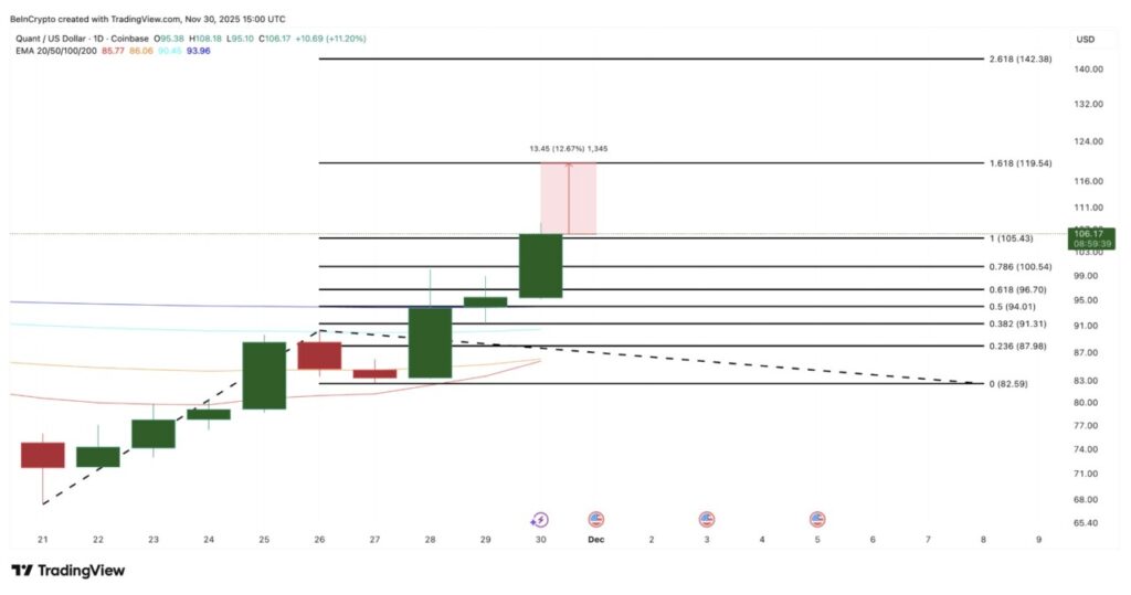 Secara teknikal, momentum masih terus membangun. QNT hampir membentuk pola bullish crossover EMA di grafik harian, di mana EMA 20-hari hampir melintasi di atas EMA 50-hari. Pola ini biasanya menjadi sinyal bahwa pembeli mulai menguasai pasar. Jika crossover ini benar-benar terjadi, QNT berpotensi melakukan lonjakan harga lanjutan.