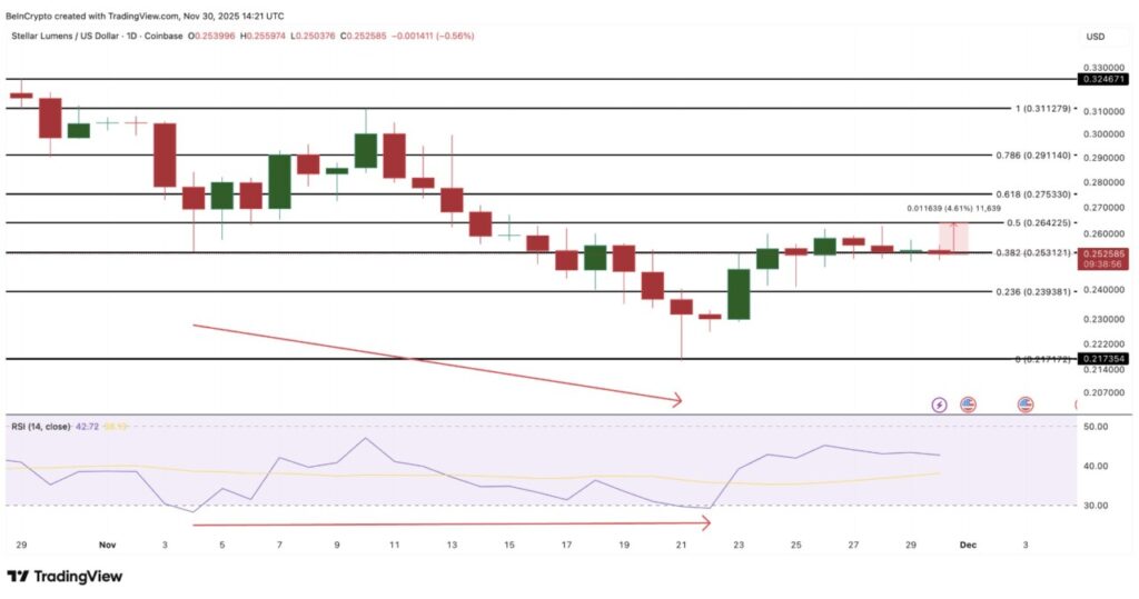 Secara teknikal, XLM perlahan membentuk pola pembalikan tren (reversal). Antara tanggal 4 hingga 21 November, harga mencetak lower low, namun Relative Strength Index (RSI) justru membentuk higher low.