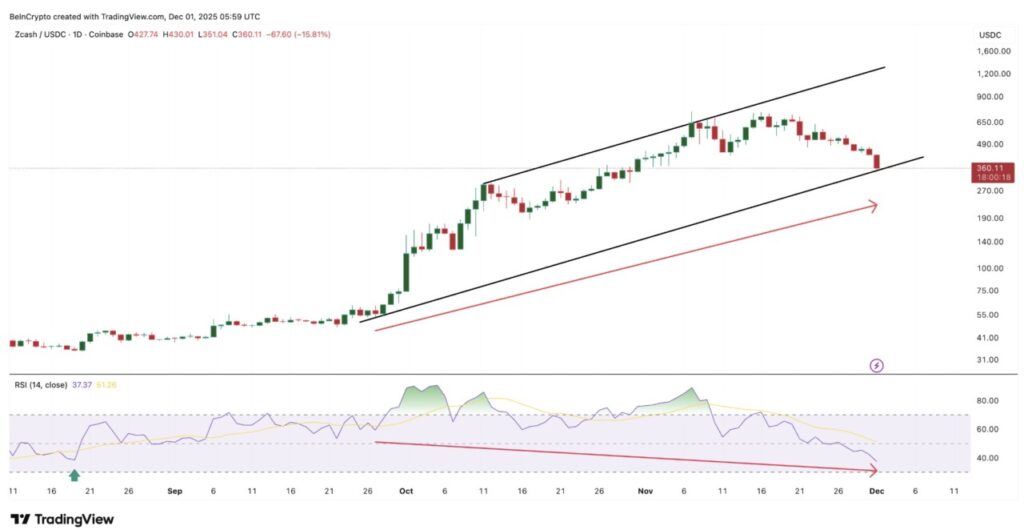 Saat ini, RSI berada mendekati zona oversold (jenuh jual). Terakhir kali RSI berada di level serendah ini — sekitar 19 Agustus — ZEC mulai mengalami kenaikan baru tak lama setelahnya.