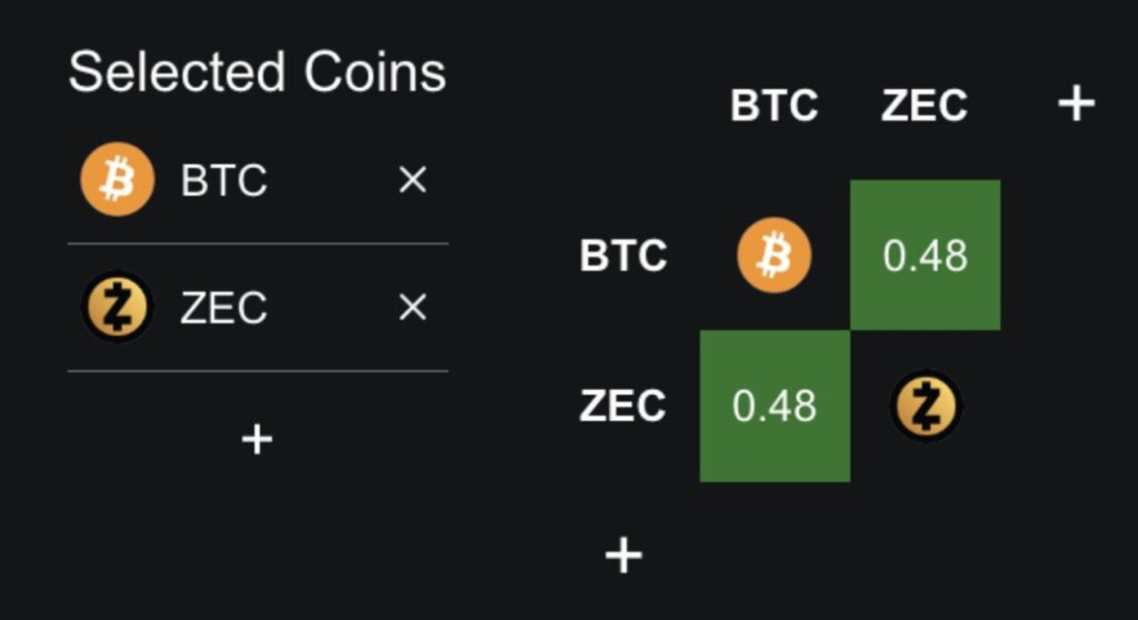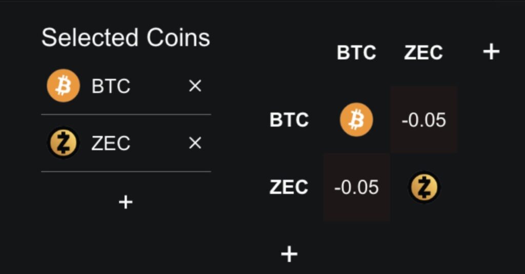 Kenaikan Zcash sebelumnya didorong oleh korelasi yang lemah atau bahkan sedikit negatif terhadap Bitcoin. Dalam setahun terakhir, korelasi antara BTC dan ZEC berada di sekitar –0,05. Hal ini memungkinkan ZEC untuk tampil lebih baik saat Bitcoin melemah.