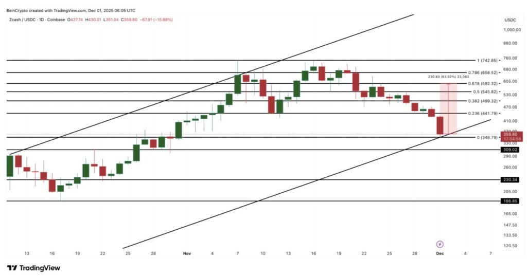 Agar harga Zcash bisa menguat kembali, ZEC harus menembus dan mempertahankan level $592 — yang merupakan titik 0.618 dalam Fibonacci retracement. Ini membutuhkan kenaikan sekitar 63,9% dari level saat ini — besar, tetapi bukan hal yang luar biasa bagi ZEC, mengingat volatilitas sebelumnya.