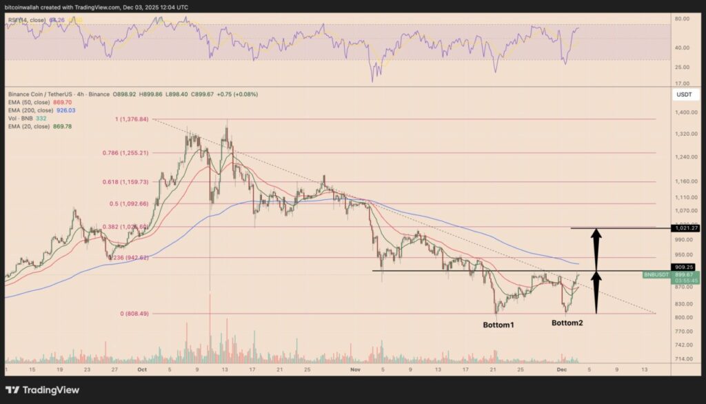 Pola double bottom yang terbentuk di zona permintaan $800–$820 telah menjadi dasar yang kuat bagi BNB untuk memulai pemulihannya. Pola ini, yang terlihat pada grafik empat jam, menandakan bahwa BNB telah menemukan dukungan yang solid dan siap untuk melonjak.
