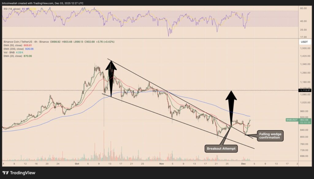 BNB baru-baru ini berhasil keluar dari pola falling wedge yang telah terbentuk selama beberapa minggu. Pola ini umumnya dianggap sebagai sinyal bullish, terutama setelah periode penjualan yang panjang. Breakout dari pola ini tidak hanya menunjukkan perubahan sentimen pasar tetapi juga potensi untuk pemulihan harga yang cepat. Dengan keluarnya BNB dari falling wedge, peluang untuk mencapai dan bahkan melampaui $1.000 menjadi semakin nyata.