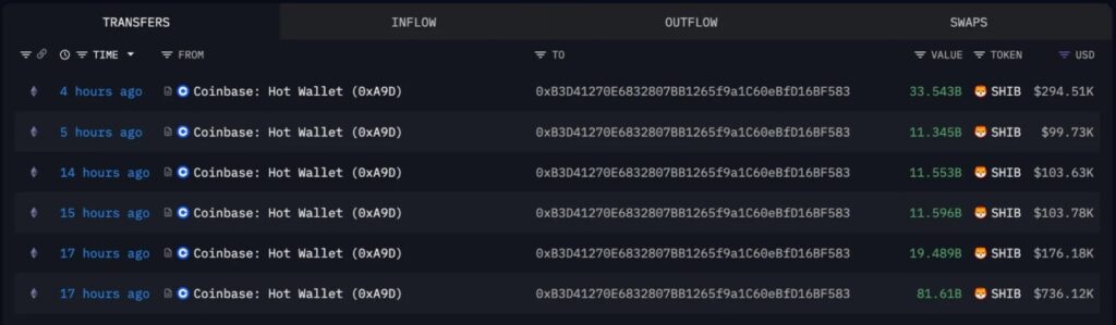 Dompet misterius ini tercatat menerima enam transfer dari dompet panas Coinbase yang sama. Transfer tersebut dilakukan secara berurutan dalam jendela waktu yang singkat, hanya 17 jam. Ukuran transfer tersebut meningkat secara signifikan, mulai dari 11 miliar SHIB hingga mencapai 81 miliar SHIB. Ini menunjukkan bahwa aksi yang dilakukan bukan sekedar pembelian biasa, melainkan pembersihan besar-besaran.