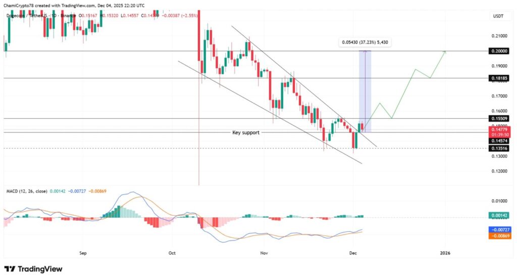 Saat ini, harga Dogecoin berada di $0,147, dengan pembeli yang terus melindungi area breakout. Harga DOGE kini meningkat dari pola falling wedge dan melakukan retest pada batas atas dengan komitmen yang stabil. Retest ini memperkuat struktur di sekitar $0,145 yang merupakan basis dukungan yang kuat bagi pembeli.