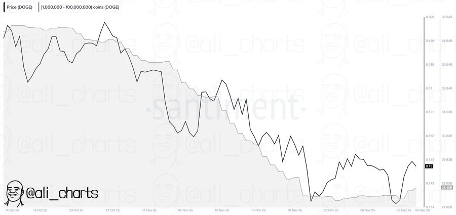 Sentimen meningkat setelah para whale menambahkan 480 juta DOGE dalam waktu 48 jam. Tindakan seperti ini menciptakan lantai permintaan yang tinggi karena pemegang besar jarang mengakumulasi posisi ketika pasar lemah.