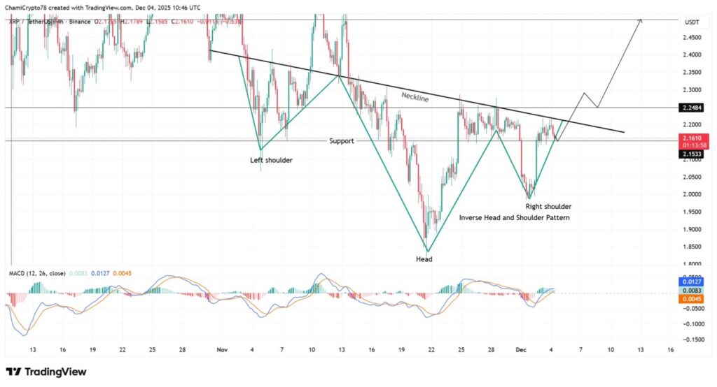 Grafik menunjukkan pola kepala dan bahu terbalik yang kuat yang memperkuat prognosis harga XRP yang ada. Bahu kiri terbentuk di awal November ketika harga bereaksi secara signifikan terhadap dukungan di $2,15.