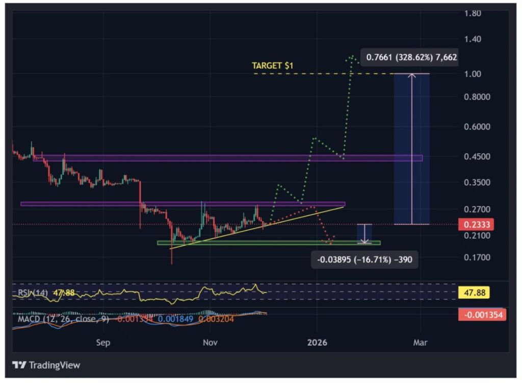 Jika berhasil menembus zona resistensi berwarna ungu, harga PI berpotensi melanjutkan kenaikan tajam. Jalur hijau pada grafik menunjukkan kemungkinan kenaikan bertahap—pertama menuju area resistensi menengah, lalu lanjut ke level $1, yang berarti potensi kenaikan hingga sekitar 328%.