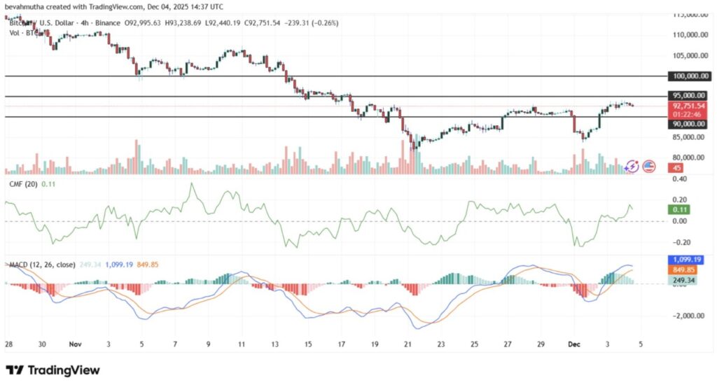 Pada 4 Desember 2025, harga BTC sempat naik menjadi $93.023, mencatat kenaikan sebesar 2%. Kenaikan ini menunjukkan momentum positif seiring Bitcoin mendekati level $95.000.