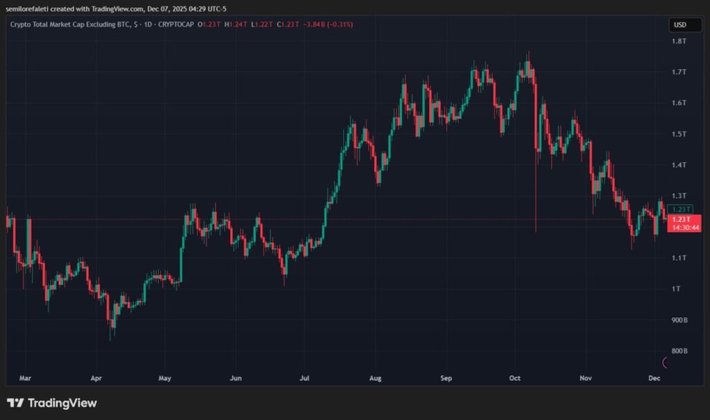 Dengan kapitalisasi $1,26 triliun, altcoin memegang hampir setengah pasar, namun belum cukup kuat untuk menggeser dominasi Bitcoin. Data ini menggambarkan bahwa investor masih berhati-hati terhadap aset berisiko tinggi.