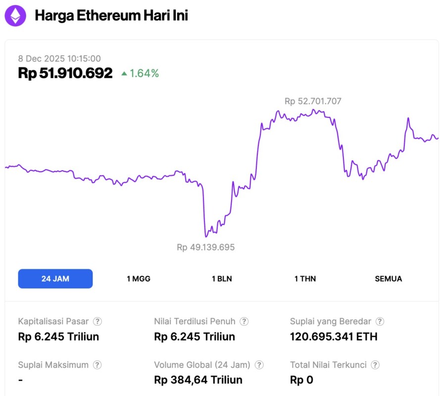 Pada 8 Desember 2025, harga Ethereum tercatat berada di sekitar $3,106 atau setara dengan Rp51.910.692, mengalami kenaikan 1,64% dalam 24 jam terakhir. Sepanjang periode ini, ETH sempat menyentuh level terendahnya di Rp49.139.695 dan level tertingginya di Rp52.701.707.