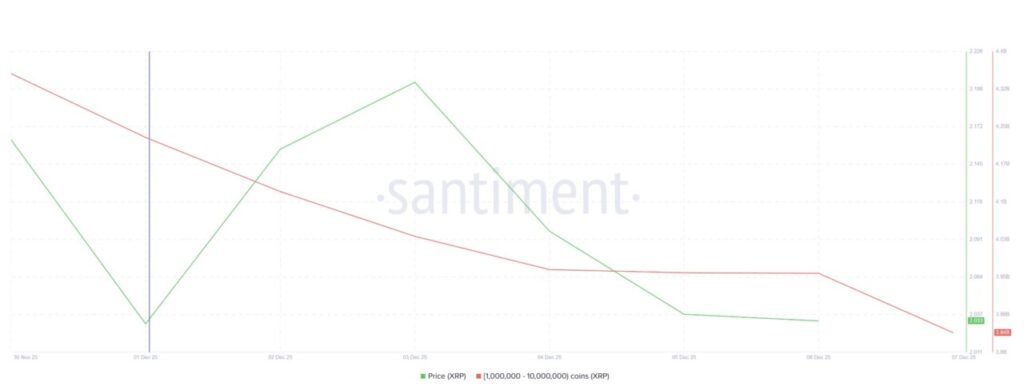 Para “whale” mulai melepas sebagian besar kepemilikan mereka. Dalam tujuh hari terakhir, dompet yang menyimpan antara 1 juta hingga 10 juta XRP telah menjual lebih dari 390 juta XRP, senilai lebih dari $783 juta berdasarkan harga saat ini.