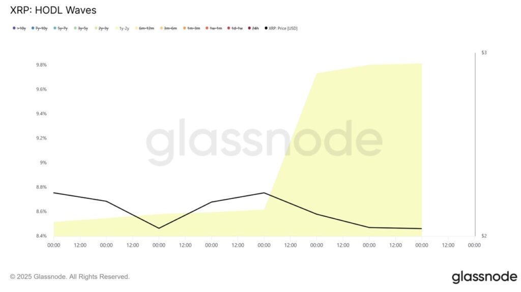 Namun, di tengah aksi jual para whale, pemegang jangka panjang justru menahan tekanan penurunan. Data dari HODL Waves menunjukkan bahwa porsi suplai XRP yang dimiliki oleh kelompok pemegang 1 hingga 2 tahun meningkat dari 8,58 persen menjadi 9,81 persen dalam seminggu terakhir.