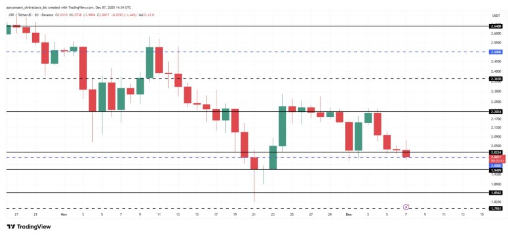 Per 7 Desember, XRP sempat diperdagangkan di level $2.00, yang merupakan level support psikologis dan teknikal yang sangat penting. Dalam beberapa hari terakhir, pergerakan harga terus kembali ke titik ini, mengonfirmasi perannya dalam menjaga struktur pasar.