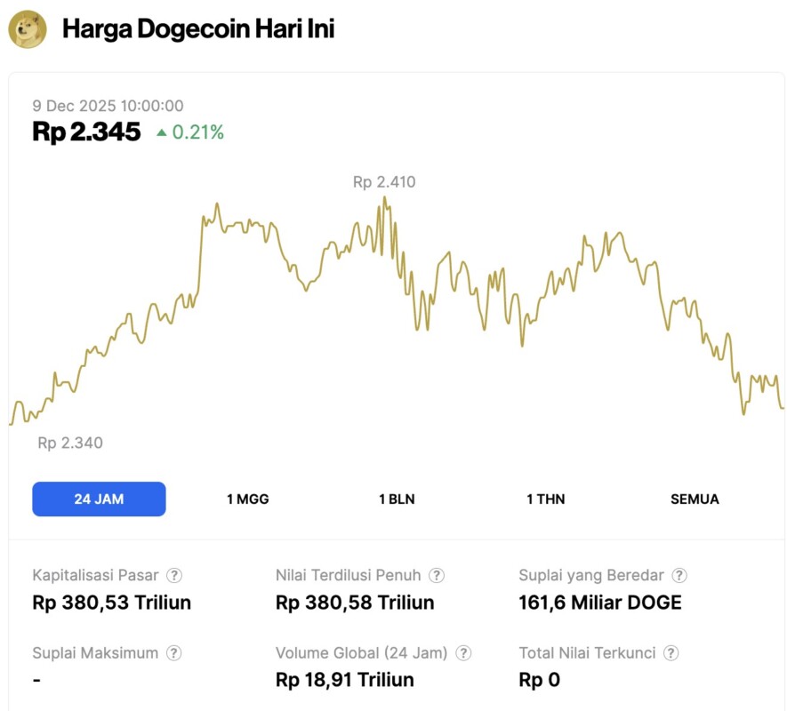 Pada 9 Desember 2025,Ā hargaĀ DogecoinĀ tercatat mengalami kenaikan tipis 0,21% dalam waktu 24 jam, diperdagangkan pada harga $0.1410 atau setara dengan Rp2.345. Dalam periode 24 jam terakhir,Ā harga DOGEĀ bergerak dalam kisaran Rp2.340 hingga ke Rp2.410.