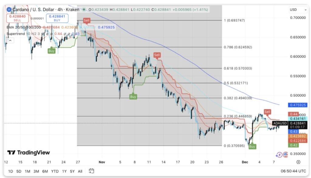 ADA masih menunjukkan pola defensif pada grafik empat jam. Harganya tetap berada di bawah EMA 200 di kisaran $0,475, yang membatasi potensi kenaikan berkelanjutan.