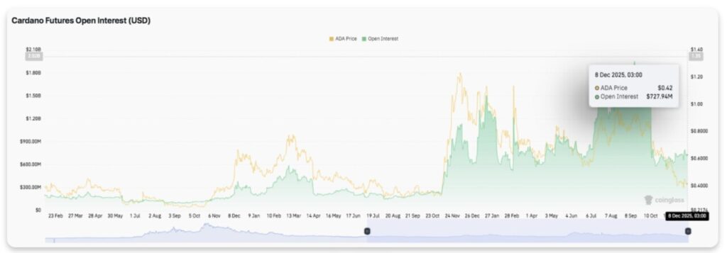 Aktivitas di pasar futures menunjukkan partisipasi derivatif yang kuat sepanjang tahun. Open interest sempat melonjak dari di bawah $300 juta menjadi lebih dari $1,5 miliar selama pergerakan besar pasar. Namun, angka ini turun menjadi $727 juta pada 8 Desember.