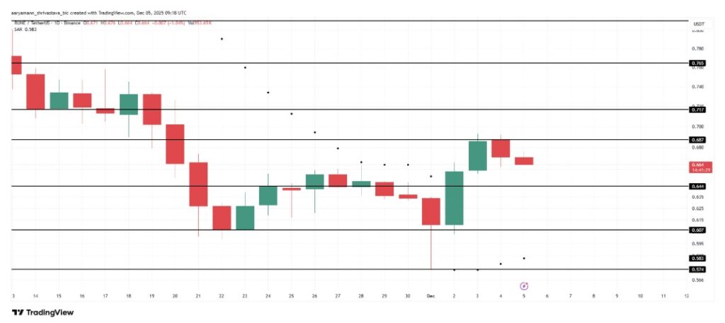 Jika momentum terus menguat, RUNE berpeluang menembus level resistensi di $0,687. Indikator Parabolic SAR yang saat ini berada di bawah grafik candlestick menunjukkan tren naik yang masih aktif, yang bisa mendorong harga ke kisaran $0,717 atau bahkan $0,765. Namun, sentimen bullish yang berkelanjutan akan sangat penting untuk melanjutkan pergerakan ini.