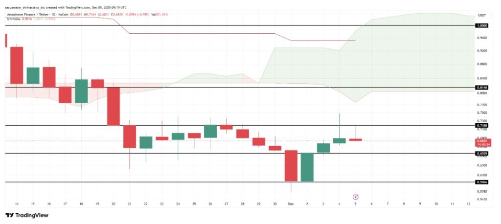 Aerodrome sempat diperdagangkan di harga $0,683, masih berada di bawah level resistensi $0,718 setelah sebelumnya memantul dari level support $0,596. Altcoin ini sempat menembus ke bawah $0,655, namun berhasil pulih dengan cepat — menandakan adanya perbaikan sentimen seiring para trader menunggu konfirmasi yang lebih jelas terhadap tren bullish.