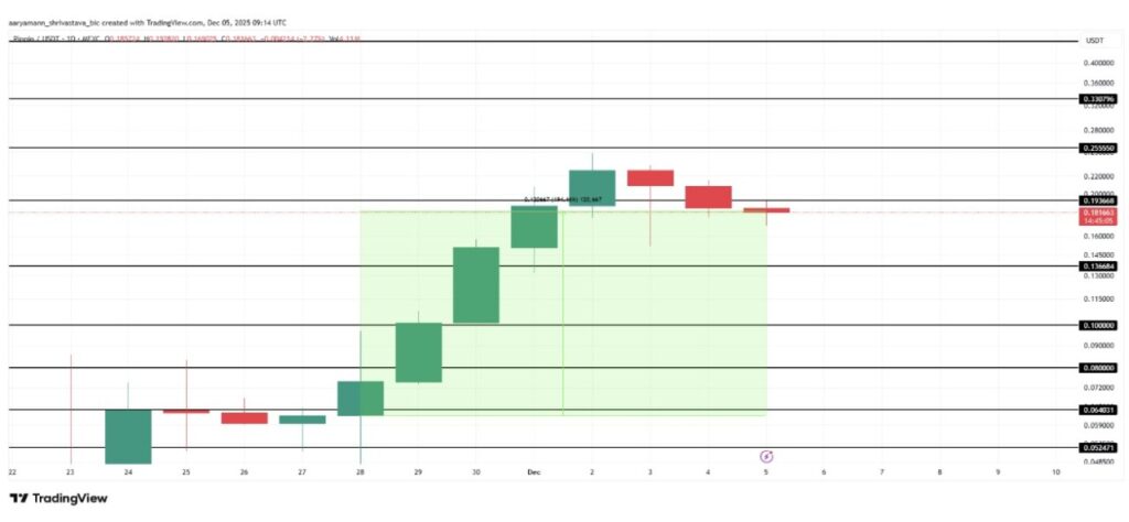 Token ini sempat diperdagangkan di harga $0,181, sedikit di bawah level resistensi $0,193. Kenaikan tajam ini mencerminkan minat spekulatif yang tinggi dari para trader yang mencari keuntungan cepat berbasis momentum.