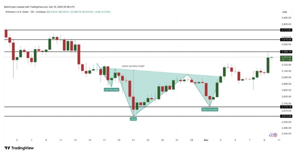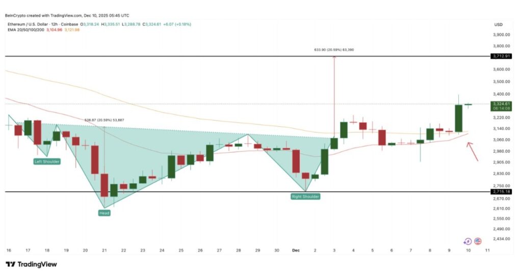 Harga Ethereum masih bergerak dalam pola breakout inverse head-and-shoulders (pola kepala dan bahu terbalik) yang mulai terbentuk sejak akhir November. Pola ini tetap valid setelah tanggal 3 Desember karena level support bahu kanan di $2.710 masih bertahan. Pola ini hanya akan melemah jika harga ETH turun di bawah level tersebut.