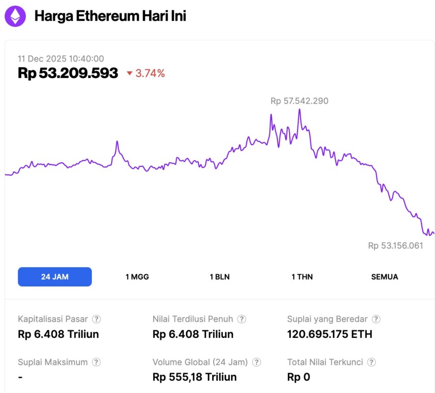 Pada 11 Desember 2025,Ā harga EthereumĀ tercatat berada di sekitar $3,185 atau setara dengan Rp53.209.593, mengalami penurunan 3,74% dalam 24 jam terakhir. Sepanjang periode ini, ETH sempat menyentuh level terendahnya di Rp53.156.061 dan level tertingginya di Rp57.542.290.