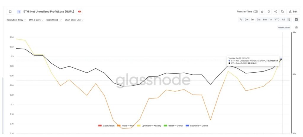 Saat ini, NUPL Ethereum telah naik ke angka 0,296, yang menempatkannya dalam zona OptimismeāKecemasan. Ini adalah level tertinggi sejak awal November.