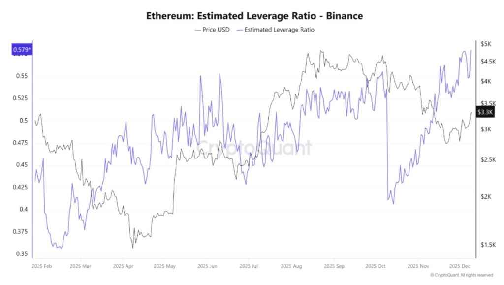Data dari CryptoQuant menunjukkan bahwa rasio leverage estimasi Ethereum (ETH) di Binance telah mencapai angka 0,579 — level tertinggi sepanjang sejarah. Angka ini mencerminkan penggunaan leverage yang sangat agresif, di mana bahkan pergerakan harga kecil bisa memicu efek domino.