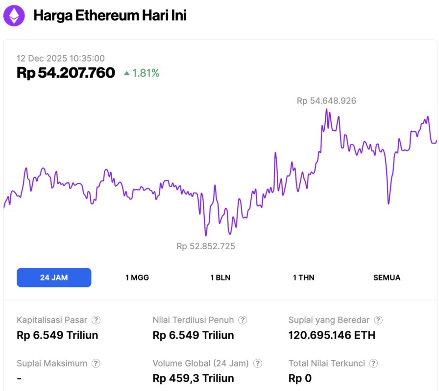 Pada 12 Desember 2025, harga Ethereum tercatat berada di sekitar $3,247 atau setara dengan Rp54.207.760, mengalami kenaikan 1,81% dalam 24 jam terakhir. Sepanjang periode ini, ETH sempat menyentuh level terendahnya di Rp52.852.725 dan level tertingginya di Rp54.648.926.