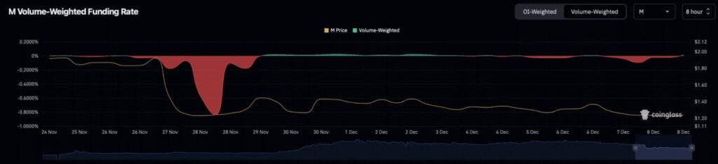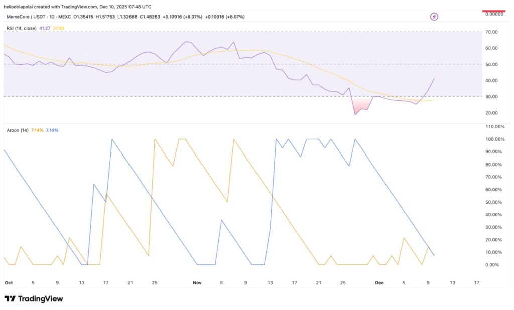 Berdasarkan data AMB Crypto, Relative Strength Index (RSI) MemeCore bergerak naik dari level oversold 21,50 pada 7 Desember menuju 41,27. Analis menilai bahwa pergerakan mendekati level 50 merupakan sinyal awal kembalinya tekanan beli. RSI yang menembus 50 biasanya dipantau trader sebagai indikasi menguatnya dominasi pembeli dalam jangka pendek.