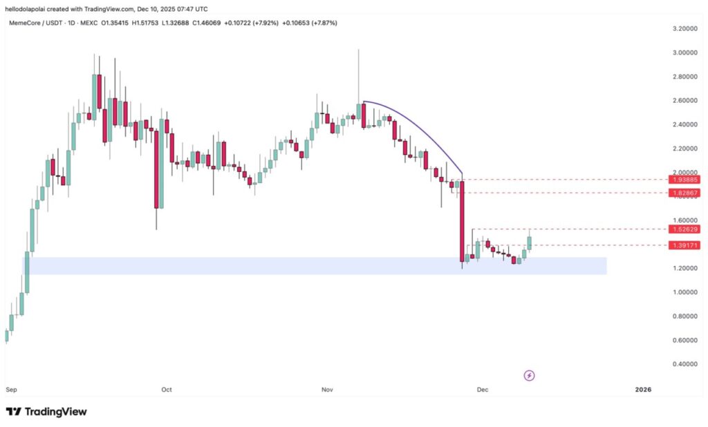 Menurut laporan AMB Crypto, segmen memecoin seperti Dogecoin dan aset serupa mengalami pelemahan hingga lebih dari 21 persen. Namun, MemeCore justru mencatat kenaikan harian sebesar 10,2 persen, menunjukkan ketahanan relatif terhadap tekanan pasar. Data ini menempatkan MemeCore sebagai salah satu altcoin yang menarik perhatian di tengah kondisi pasar yang lesu.