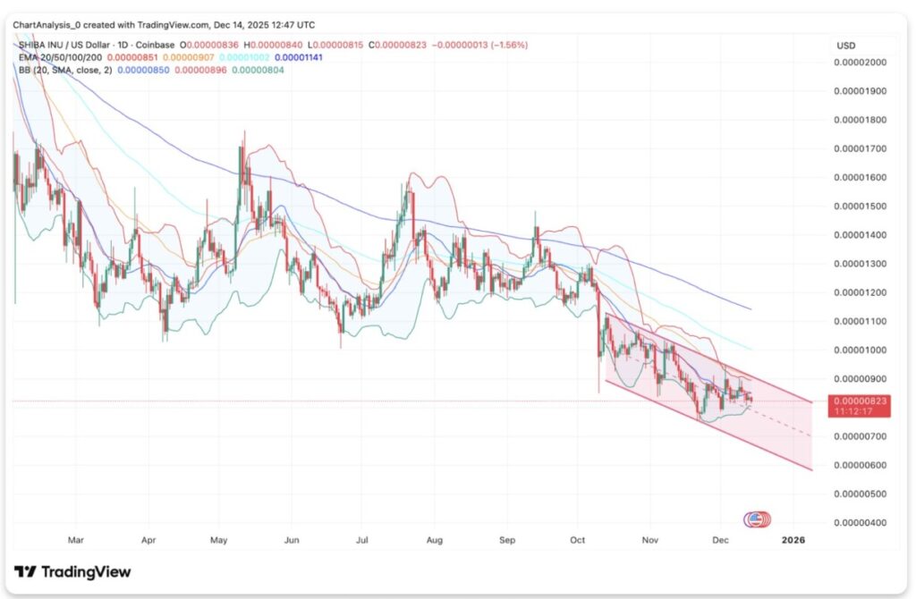 Jakarta, Pintu News ā Harga Shiba Inu sempat diperdagangkan di kisaran $0.00000823 pada 15 Desember setelah melanjutkan penurunan dalam pola saluran menurun yang jelas. Pergerakan ini menunjukkan bahwa tekanan dari penjual masih dominan, karena harga kesulitan bertahan di level support jangka pendek.