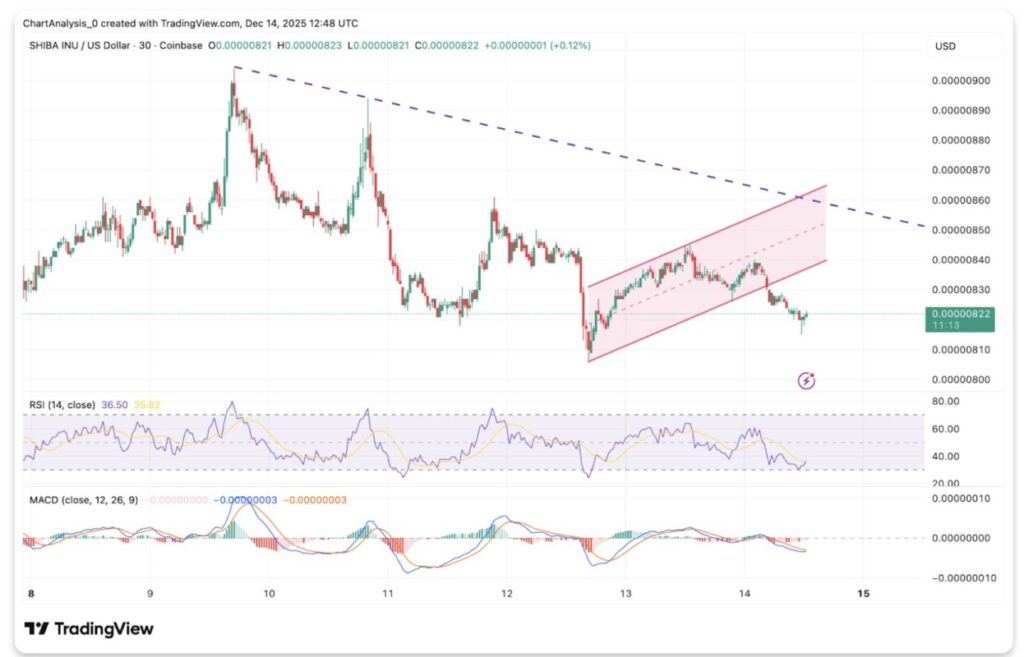 Pada grafik 30-menit (15/12), SHIB sempat mencoba rebound dalam saluran naik jangka pendek, namun struktur tersebut mulai gagal. Harga kini kembali mendekati batas bawah dari kisaran pergerakan intraday.