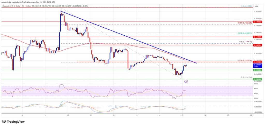 Jika harga DOGE gagal naik di atas level $0,1400, kemungkinan akan terus bergerak turun. Dukungan awal di sisi bawah berada di dekat level $0,1340, dengan dukungan besar berikutnya dekat level $0,1325. Dukungan utama berada di $0,130. Jika terjadi penembusan ke bawah dukungan $0,130, harga bisa turun lebih lanjut. Dalam kasus tersebut, harga mungkin meluncur ke arah level $0,1250 atau bahkan $0,1240 dalam waktu dekat.
