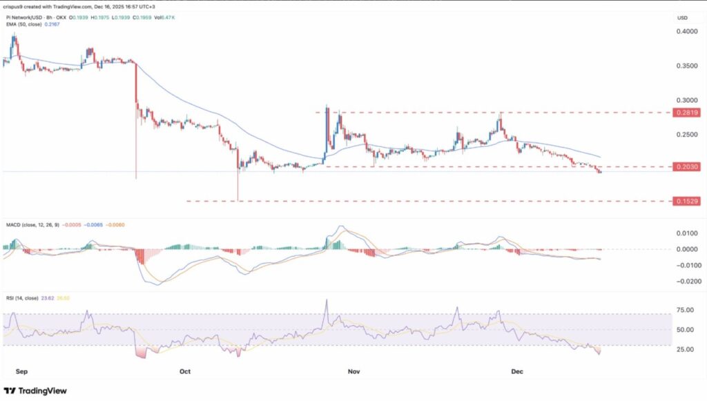 Grafik pada timeframe 8 jam (16/12) memperlihatkan bahwa harga Pi Coin mengalami pembalikan arah yang tajam dalam beberapa minggu terakhir, turun dari level tertinggi bulan lalu di $0,2820 ke sekitar $0,1960.