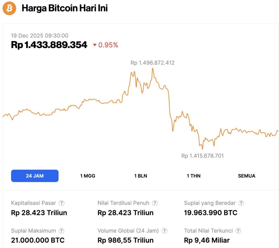 Pada 19 Desember 2025,Ā harga BitcoinĀ tercatat berada di level $85,469 atau setara dengan Rp1.433.889.354, mengalami koreksi 0,95% dalam 24 jam terakhir. Sepanjang periode ini, BTC menyentuh level terendahnya di Rp1.415.678.701 dan harga tertingginya di Rp1.496.872.412.