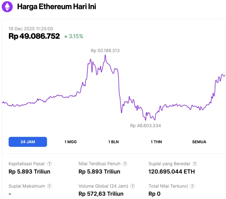 Pada 19 Desember 2025, harga Ethereum tercatat berada di sekitar $$2,919 atau setara dengan Rp49.086.752, mengalami kenaikan 3,15% dalam 24 jam terakhir. Sepanjang periode ini, ETH sempat menyentuh level terendahnya di Rp46.603.3347 dan level tertingginya di Rp50.186.313.