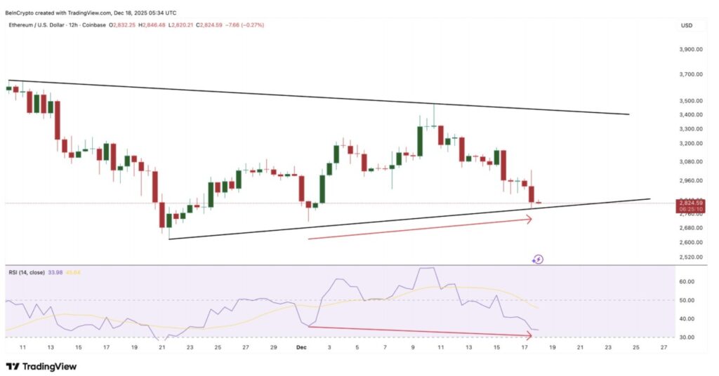 Antara 1 Desember dan 17 Desember, ETH mencetak titik rendah yang lebih tinggi pada harga. Pada saat yang sama, RSI (Relative Strength Index), alat pengukur momentum, mencetak titik rendah yang lebih rendah. Ini menciptakan divergensi bullish tersembunyi, yang berarti momentum penurunan mulai melemah.