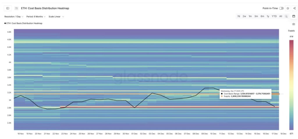 Resistance jangka pendek yang terkuat terletak antara $3,154 dan $3,179, di mana sekitar 2,8 juta ETH terkumpul. Ini adalah zona pasokan yang berat. Ketika harga kembali ke rentang ini, banyak pemegang yang mencapai titik impas dan cenderung untuk menjual.