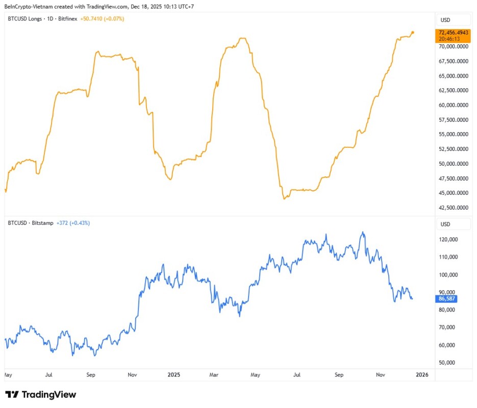 Metrik long whale di Bitfinex telah lama dianggap sebagai indikator potensial dalam analisis teknikal. Namun, interpretasi dari data ini membutuhkan kehati-hatian. Para trader ini memiliki pola yang terdokumentasi dalam meningkatkan eksposur long selama penurunan dan mengurangi posisi saat kekuatan pasar meningkat.