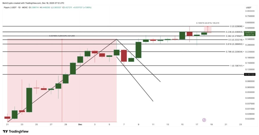Pippin sempat menyentuh harga tertinggi sepanjang masa pada 16 Desember dan terus diperdagangkan sedikit di bawah zona tersebut. Token ini tetap berada di dalam pola bendera bullish, sebuah pola kelanjutan yang sering kali berakhir dengan pergerakan harga yang lebih tinggi saat kondisi pasar yang lebih luas mendukung.