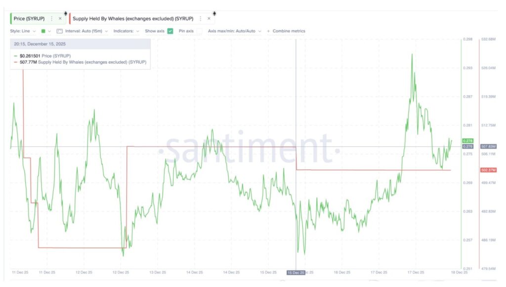Kepemilikan whale mencapai puncaknya di 507,83 juta SYRUP pada 15 Desember. Sejak saat itu, saldo mereka turun menjadi 502,37 juta, yang berarti whale telah menjual sekitar 5,46 juta SYRUP hanya dalam beberapa hari. Ini setara dengan sekitar $1,5 juta dalam distribusi bersih.