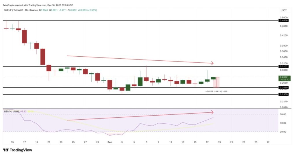 Dari sudut pandang chart, SYRUP telah mencetak puncak yang lebih rendah antara 24 November dan 18 Desember. Sementara itu, RSI (Relative Strength Index), yang mengukur momentum, mencetak puncak yang lebih tinggi. Ini menciptakan divergensi bearish tersembunyi. Momentum memang meningkat, tetapi harga tidak mengikuti. Kombinasi ini sering kali menandakan kelelahan, bukan kekuatan.