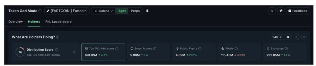 Saldo whale standar telah turun sebesar 3,83%, mengurangi kepemilikan menjadi 115,45 juta FARTCOIN. Ini menunjukkan pengurangan bersih sekitar 4,6 juta token. Namun, whale mega menceritakan kisah yang berbeda. 100 alamat teratas telah meningkatkan kepemilikan mereka sebesar 4,3%, mengangkat total simpanan mereka menjadi 691,91 juta FARTCOIN.