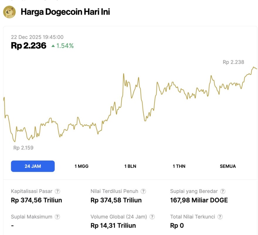 Pada 22 Desember 2025, harga Dogecoin tercatat mengalami kenaikan 1,54% dalam waktu 24 jam, diperdagangkan pada harga $0.1331 atau setara dengan Rp2.236. Dalam periode 24 jam terakhir, harga DOGE bergerak dalam kisaran Rp2.159 hingga ke Rp2.238.