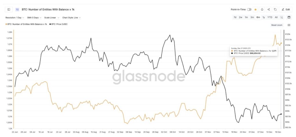 Sejak 20 Desember, jumlah entitas besar tersebut perlahan meningkat. Meski masih sedikit di bawah level tertinggi enam bulan terakhir, arah pergerakannya penting — para whale tampak hati-hati menambah eksposur seiring harga BTC yang mulai stabil.